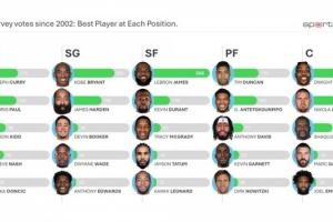 体育资讯10月14日讯 今日,NBA数据专家Todd Whitehead统计了自从2002年以来联盟总经理调查投票对于“各个位置最佳球员”的得票最多球员。